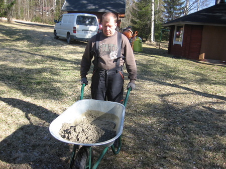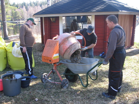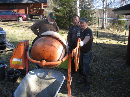 Toverit työn touhussa Lossilan saunan lattiavalutalkoissa 26.4.2014